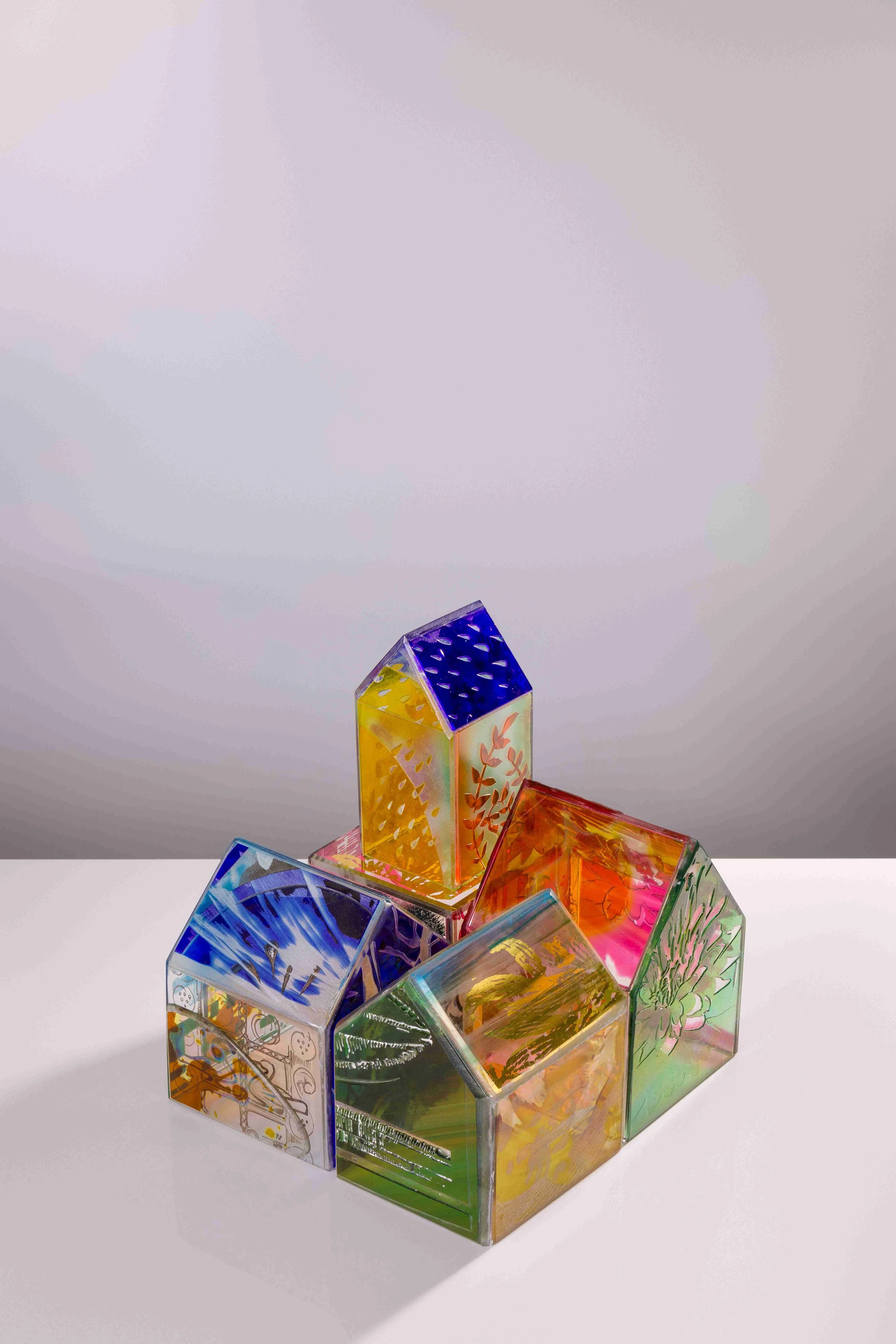 Each house in this collection is an exploration of individual identity: the way we construct ourselves, carry ourselves, present ourselves to the world. Transparency and opacity shift across the forms, suggesting the interplay between what we reveal and what we hold private, between lightness and the weight we bear.