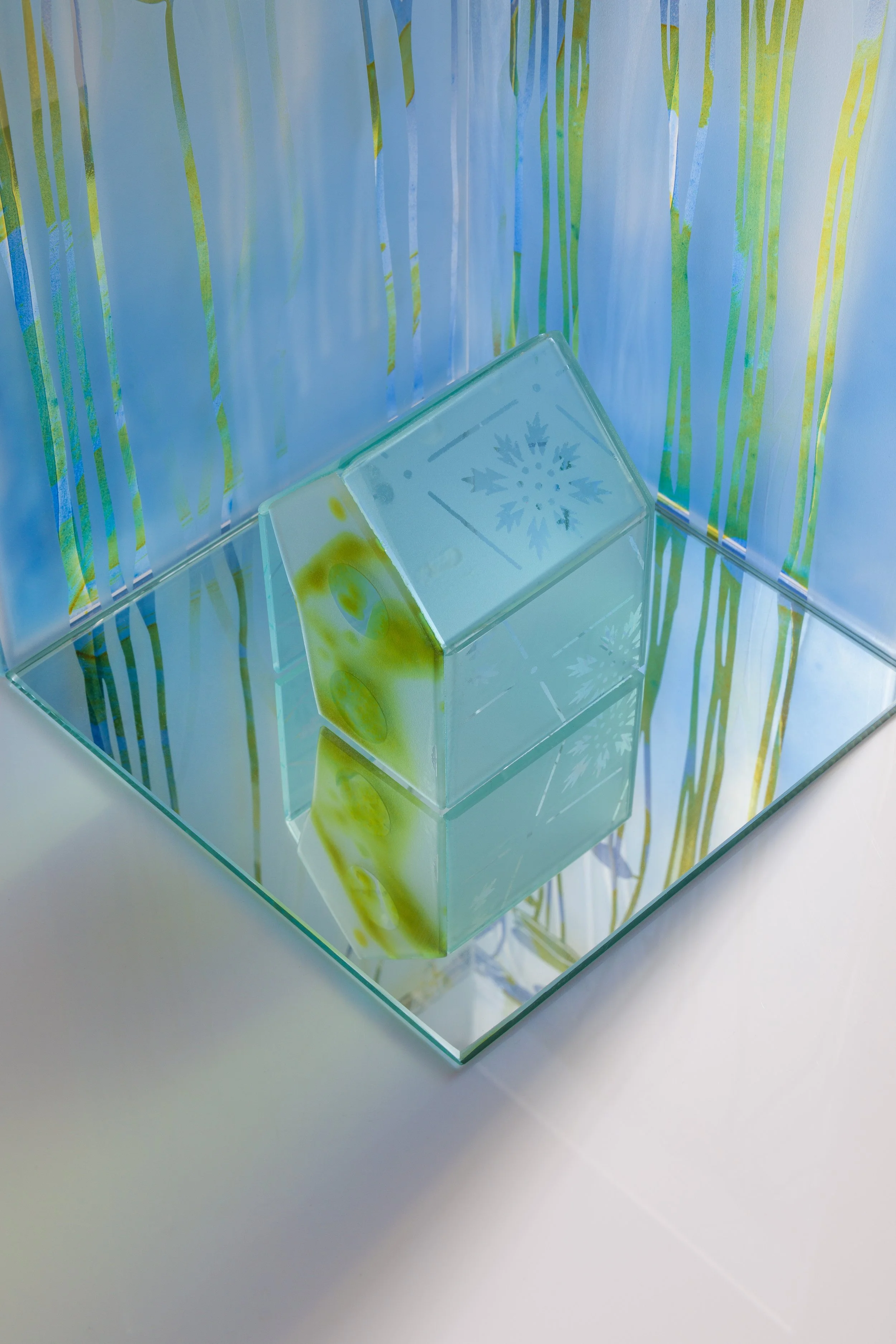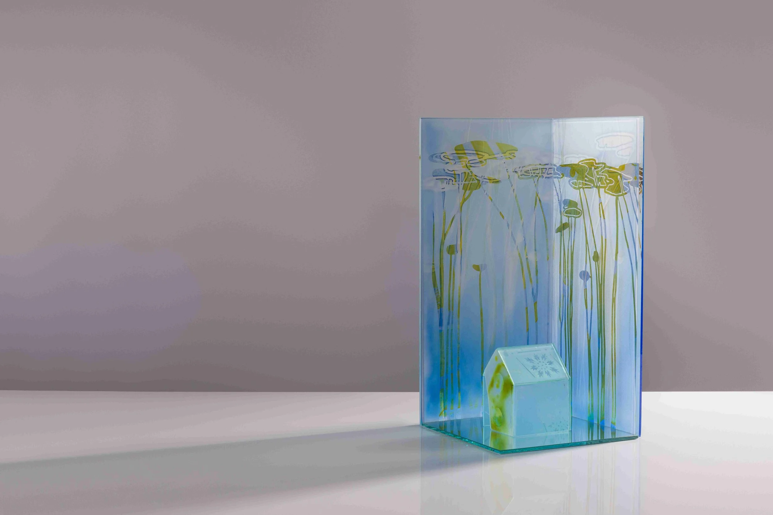 Water and glass have always been powerfully linked in my imagination, both visually and emotionally. Light moves through each of them in similar ways: filtered, diffused, transformed. Here, enamelled, silver-stained and sandblasted glass builds up silent underwater layers of muted colour and light — the quality of a world seen from below the surface. At the centre, a small and imperfect dwelling rests quietly. It is reflected in the water around it— a moment of stillness held within something that has also known great force.